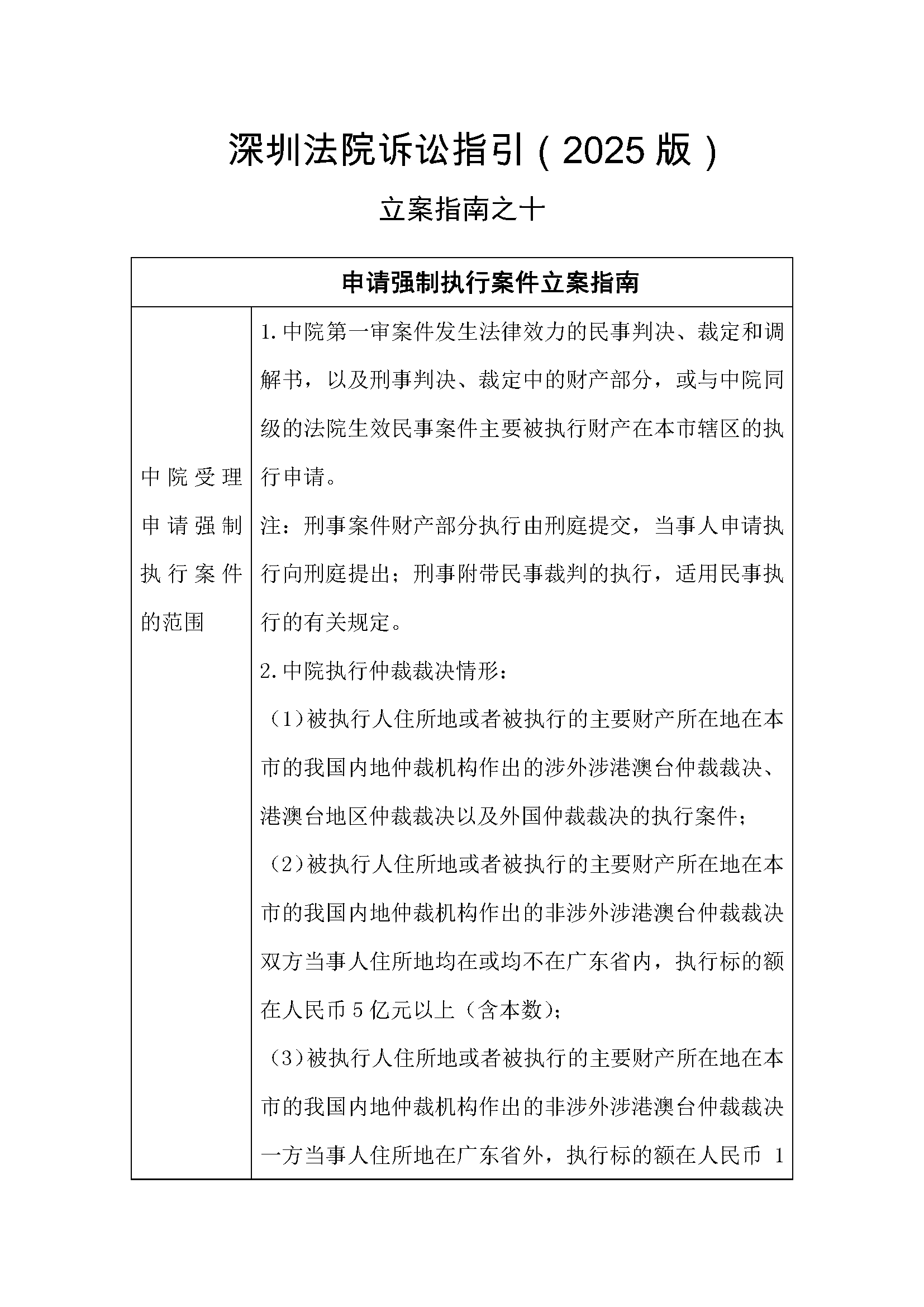 深圳市中级人民法院办理申请强制执行案件立案指南(2025年版)