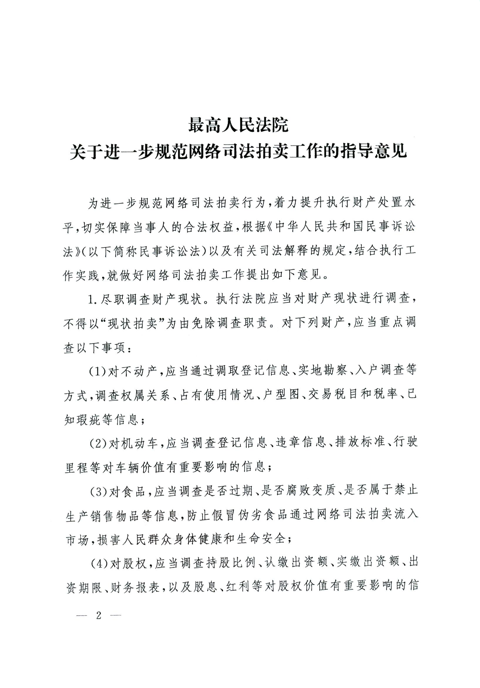 最高人民法院印发《关于进一步规范网络司法拍卖工作的指导意见》的通知
