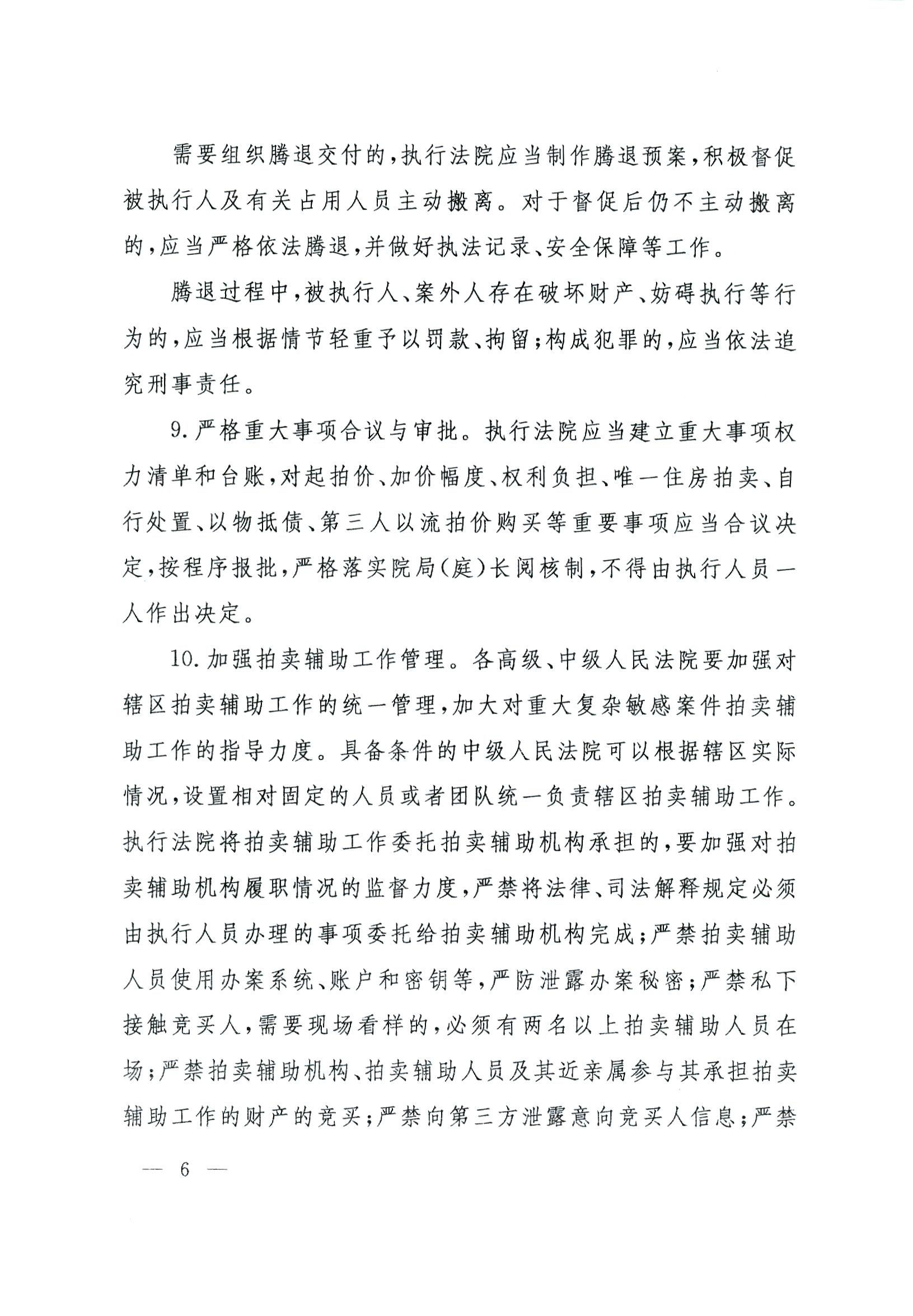 6.如实披露拍卖财产信息。执行法院应当全面如实披露财产调查所掌握的拍卖财产现状、占有使用情况、已知瑕疵和权利负担等信息,严禁隐瞒或者夸大拍卖财产瑕疵。