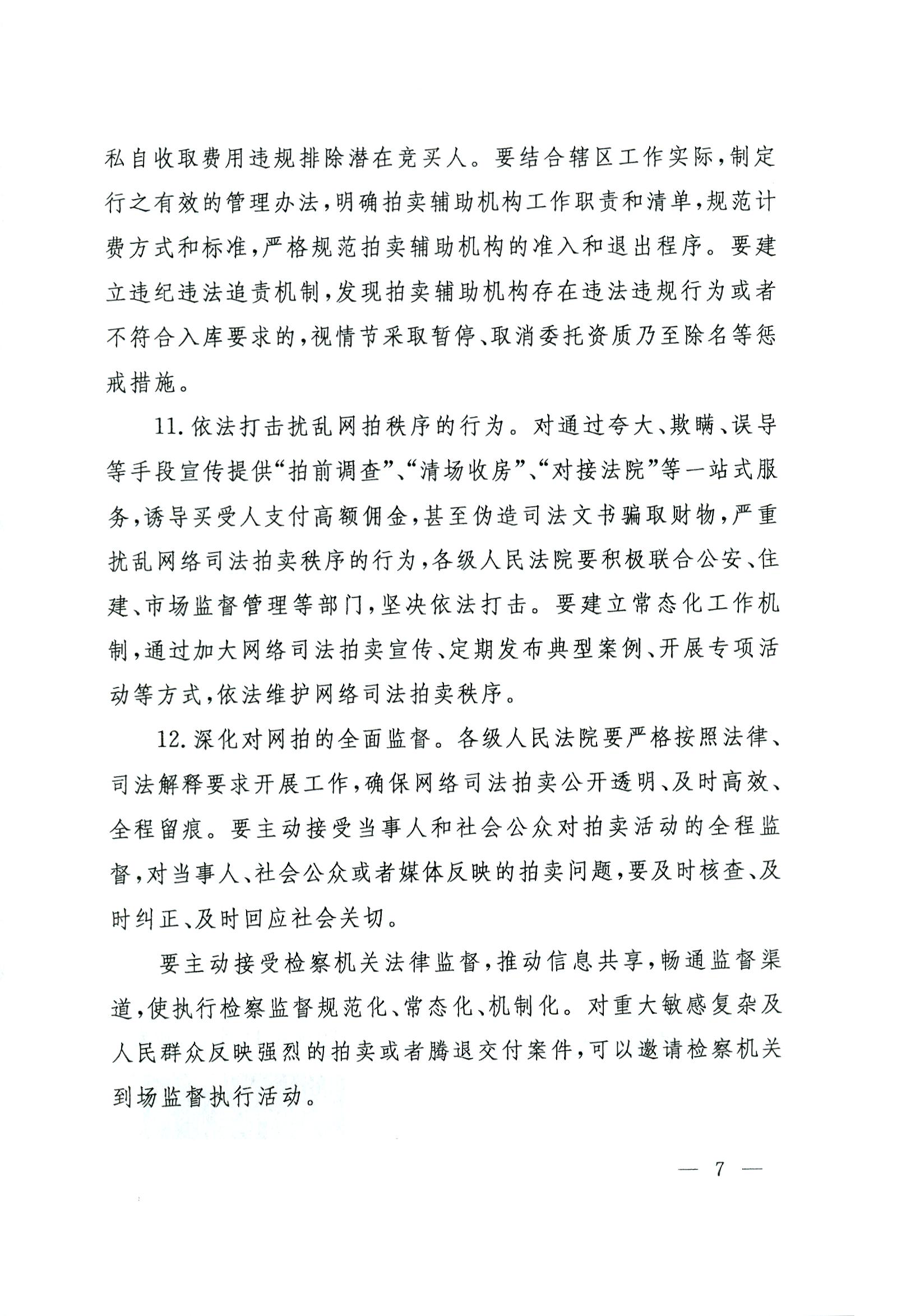 12.深化对网拍的全面监督。各级人民法院要严格按照法律、司法解释要求开展工作,确保网络司法拍卖公开透明、及时高效、全程留痕。要主动接受当事人和社会公众对拍卖活动的全程监督,对当事人、社会公众或者媒体反映的拍卖问题,要及时核查、及时纠正、及时回应社会关切。